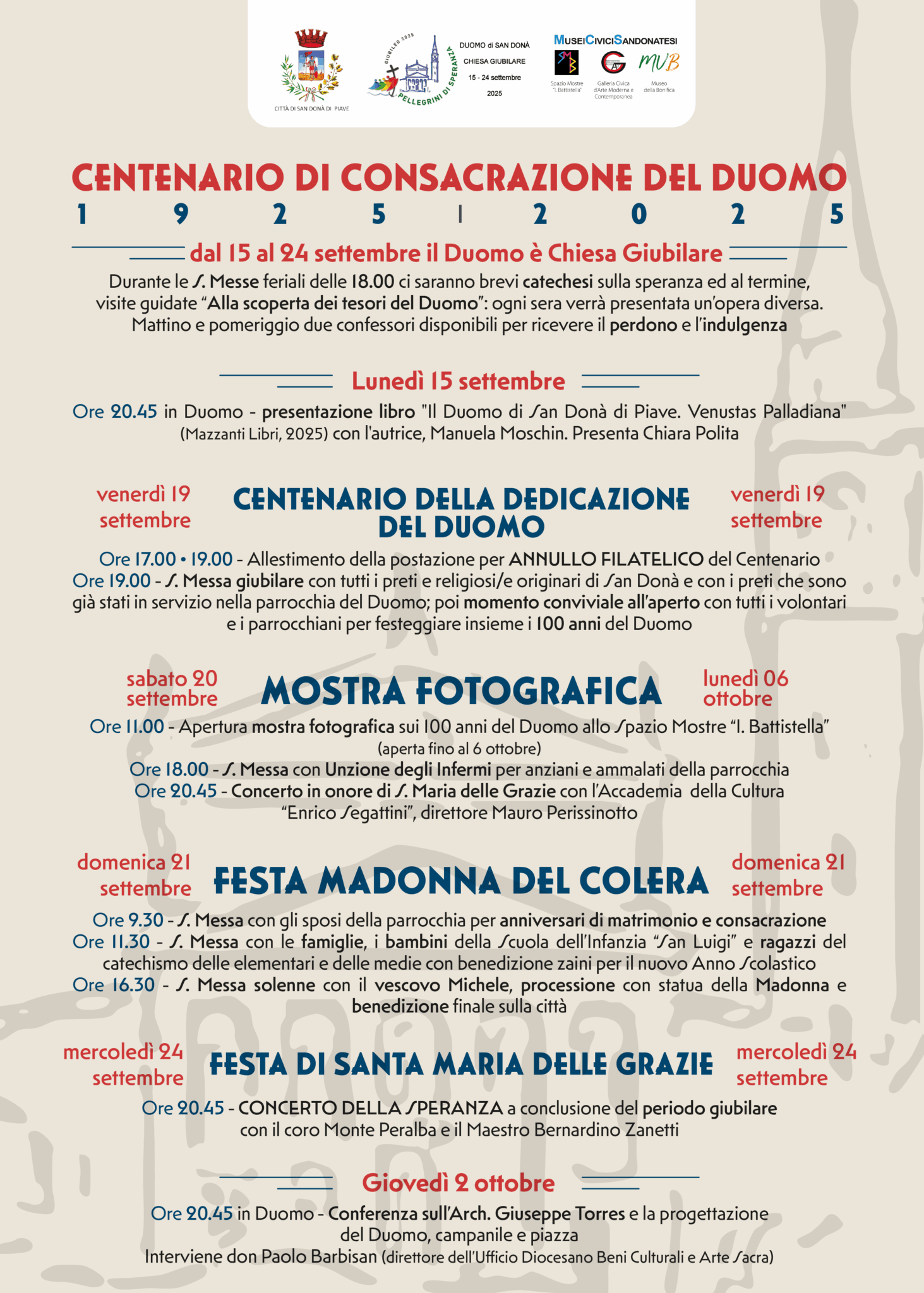 Gli appuntamenti per il centenario del Duomo di San Donà di Piave volgono al termine. Giovedì 2 ottobre alle 20.45 presso il Duomo di San Donà si terrà una conferenza sulla figura del suo autore, l’architetto Giuseppe Torres, a cura di don Paolo Barbisan, direttore dell’Ufficio Beni Culturali e Arte Sacra della diocesi, incaricato Unico Triveneto per i Beni Culturali Ecclesiastici e l’Edilizia di Culto.